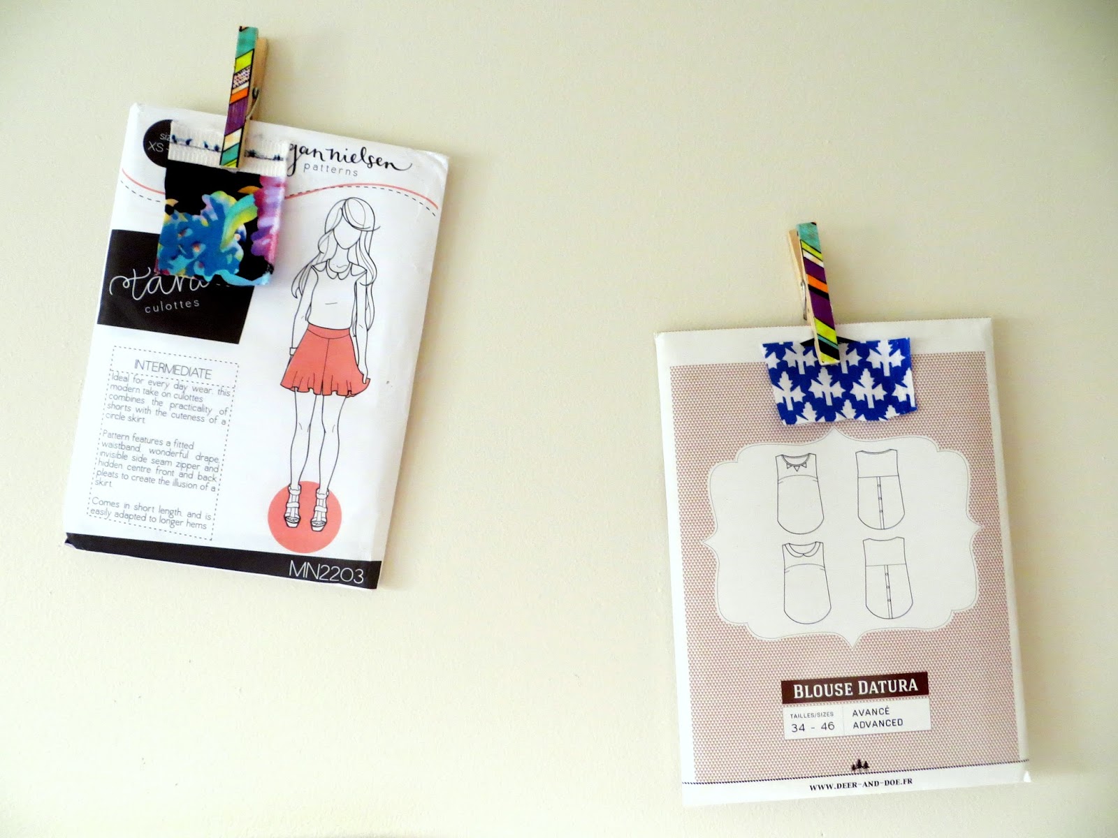 Splendid to see you! Today I have a little tip for all you sewists out there on how to hang/display your patterns that are in use, or in the "queue". I don't know about you, but sometimes I get overwhelmed by all the potential projects in my pattern/fabric stash and I thought it would be nice to display the patterns and fabric swatches for projects I am ready to make! Originally I was just going to add this to my little mood board, but there was not enough space, and I didn't want to put little holes in my nice pattern envelopes, or holes in the wall - lol. So here is my solution to the problem: DIY clothespins as pattern hangers / clips!
