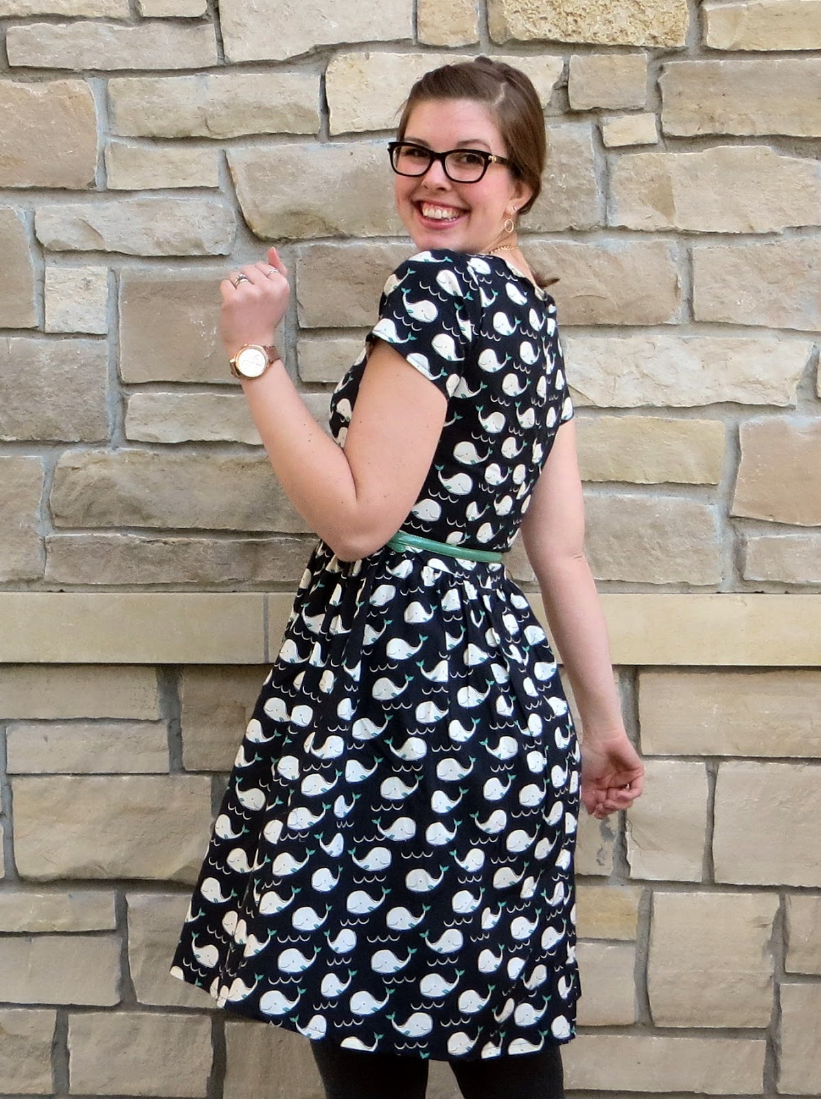 Happy Monday, friends! Finally the sun has started to shine here in Chicago-land and I could not be more excited :) Last weekend was my cousin-in-law's wedding shower. The theme was tropical and she loves marine biology, so I decided to whip up a dress with this whale print cotton that has been in my stash since last summer. But these are not just any regular old whales...