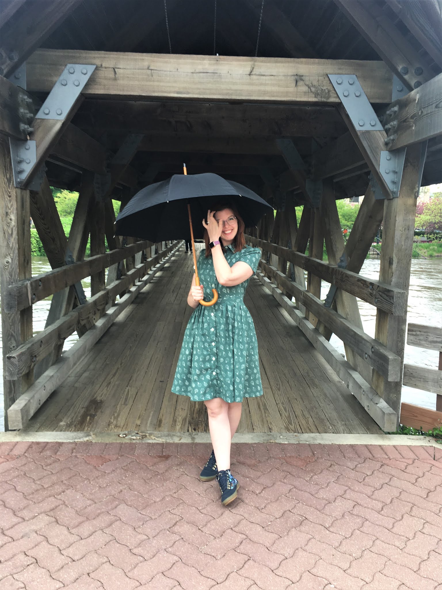 This could be my quarantine theme song... not only have I been feeling blue, but it has been raining SO MUCH (see flooded river in background). With all this time spent at home, I have realized how therapeutic sewing can be. Taking my mind off the chaos to focus on making this dress: puzzling pattern pieces to fit the fabric, adding special design details, stitching all the pleats twice (whoops), so much unexpected hand sewing, rationing thread, and waiting a month for the perfect buttons to arrive... sounds stressful but it gave me something to do, and to create. I took my time to make a dress I will cherish long after this is over. These fabric people with their umbrellas will always remind me that no matter how bad the storm, just keep walking and soon you'll find the rainbow :)
